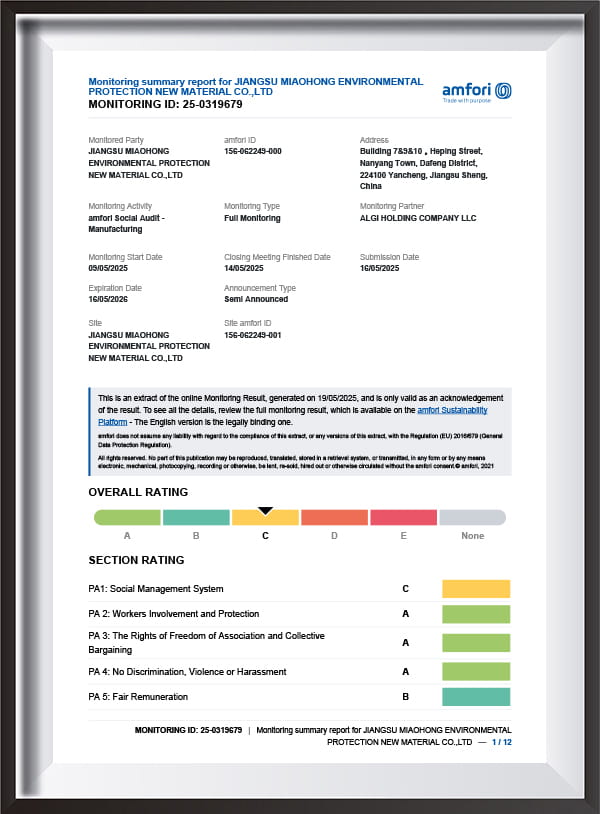Kilang kami membina sistem pemprosesan dan kawalan kualiti yang unik selepas sedozen tahun penerokaan dan amalan. Kilang kami telah pun lulus audit kualiti ISO 9001 dan BSCI.
