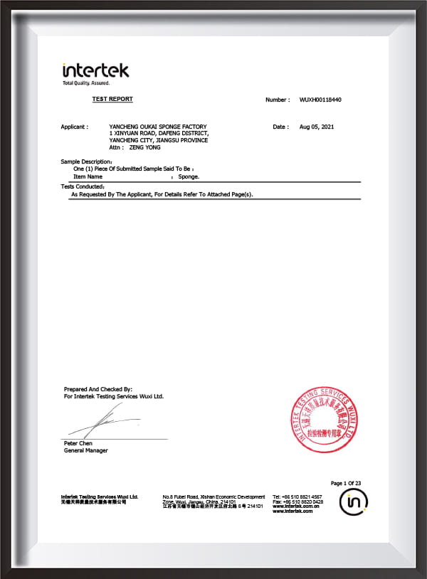 Yancheng Oukai Sponge Products Co., Ltd. telah ditubuhkan pada tahun 2009 dan meliputi kawasan seluas 10000 meter persegi. Syarikat kami terletak di bandar Dafeng. Lalu lintas di sini sangat mudah: hanya 40 kilometer dari Lapangan Terbang Yancheng, dan 30 kilometer dari Pelabuhan Dafeng. Syarikat kami akan sentiasa mengikut falsafah operasi "berorientasikan rakyat, niat baik, jaminan kualiti" untuk menyediakan produk span berkualiti tinggi untuk semua pelanggan di dalam dan di luar negara.