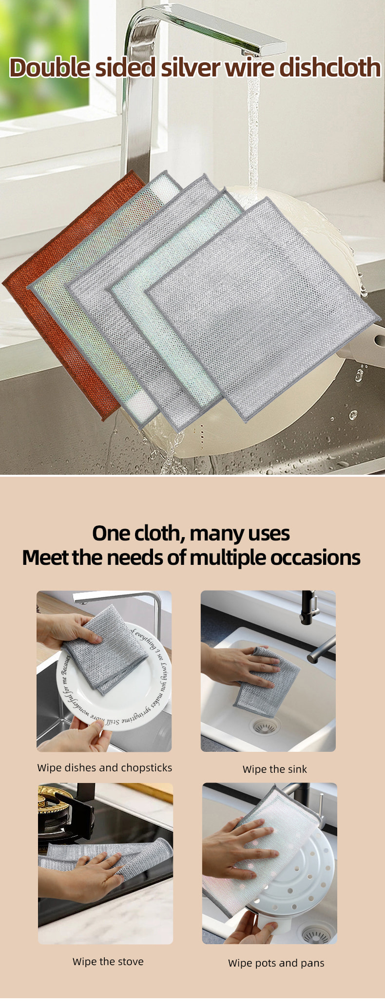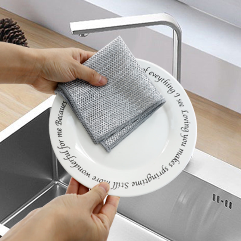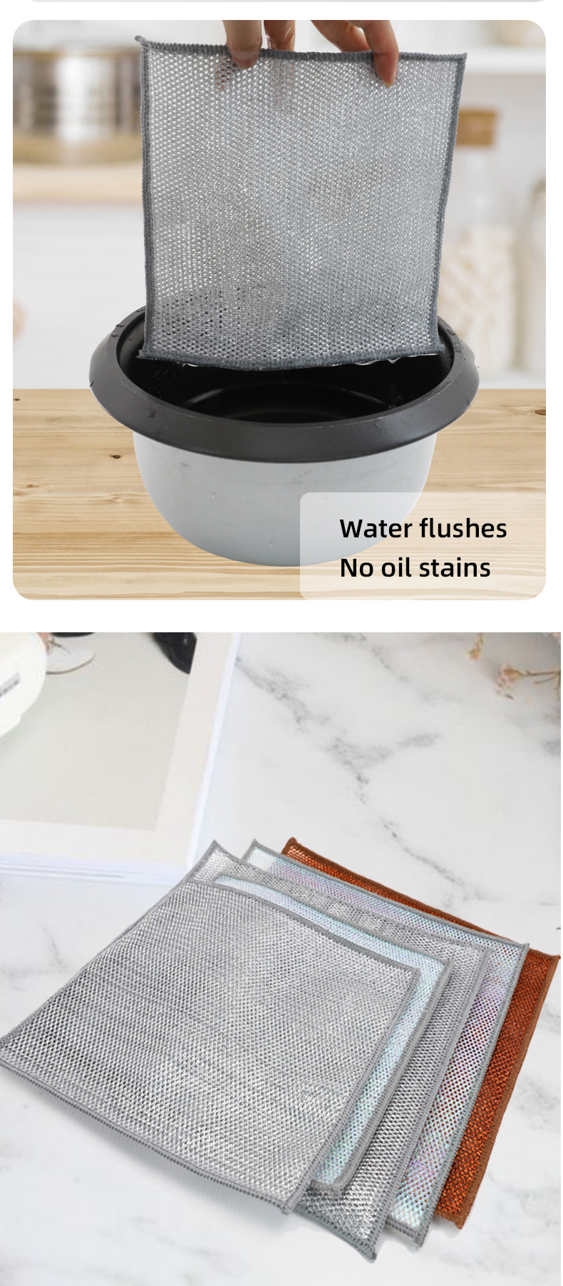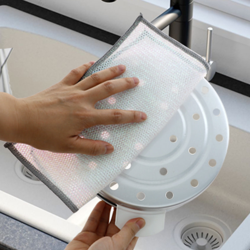 Kain pinggan mangkuk dawai perak dua sisi, Diperbuat daripada sutera gangsa, ia sangat mahal; Tiada salutan, tiada serbuk, tiada pudar; Tiada minyak, tiada minyak, kikis kuat tetapi tiada kerosakan pada alat memasak. Diperbuat daripada sutera berwarna-warni, ia berminyak dan tidak melekit, dengan nilai penampilan yang tinggi; Tiada salutan, tiada serbuk jatuh, tiada warna pudar; Mengikis kuat tetapi tiada kerosakan pada alat memasak.