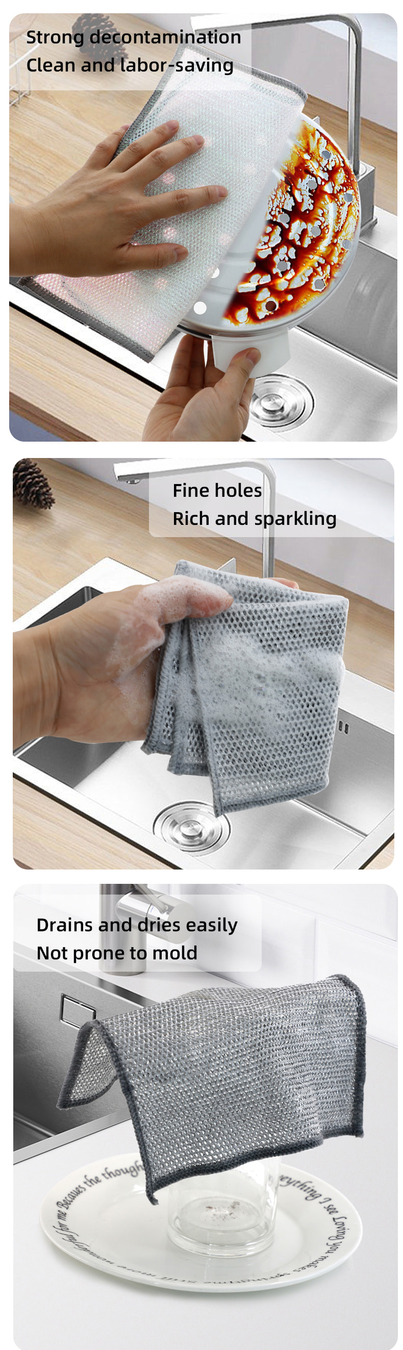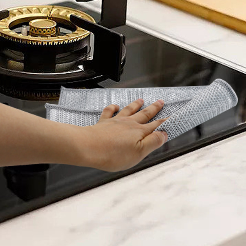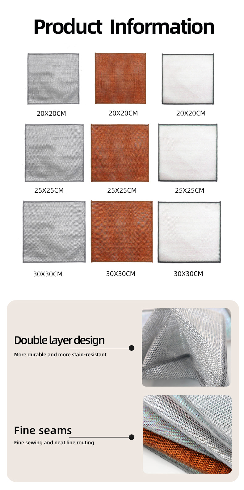 Kain pinggan mangkuk dawai perak dua sisi, Diperbuat daripada sutera gangsa, ia sangat mahal; Tiada salutan, tiada serbuk, tiada pudar; Tiada minyak, tiada minyak, kikis kuat tetapi tiada kerosakan pada alat memasak. Diperbuat daripada sutera berwarna-warni, ia berminyak dan tidak melekit, dengan nilai penampilan yang tinggi; Tiada salutan, tiada serbuk jatuh, tiada warna pudar; Mengikis kuat tetapi tiada kerosakan pada alat memasak.